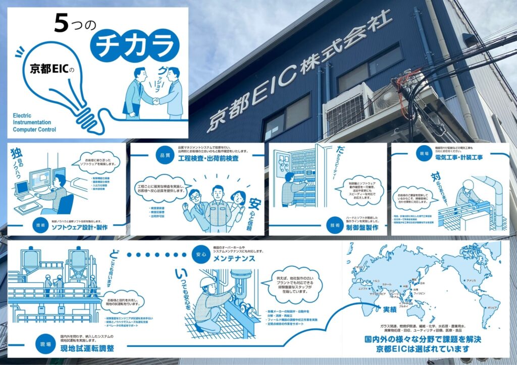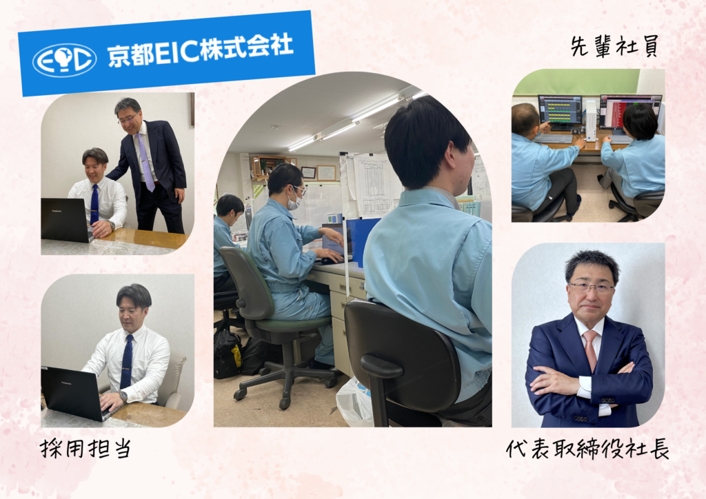 京都EIC株式会社は、「地球に優しい、人に優しい」を理念に、オートメーション技術を通じて社会に貢献する会社です。 私たちは、価値ある製品・サービスを提供するとともに、社員一人ひとりが成長し、やりがいを持って働ける環境を大切にしています。 若い人も技術を磨き、新たな挑戦を続け、地球と人の未来に貢献し、共に成長していきましょう。