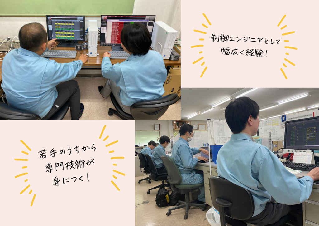 自社工場内で、制御盤や設備を使ってプログラムの動作確認を行います。「思った通りに動かない」「原因はどこか」を考え、修正することで、制御技術者としての考え方・問題解決力が身についていきます。